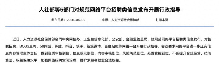 近日,东谈主社部团结中央网信办、工信部、公安部、金融监管总局五大部门生僻联手,对智联招聘、BOSS直聘、58同城、脉脉、抖音、快手、微博、百度贴吧这8家主流平台,开展诱骗行政指示。