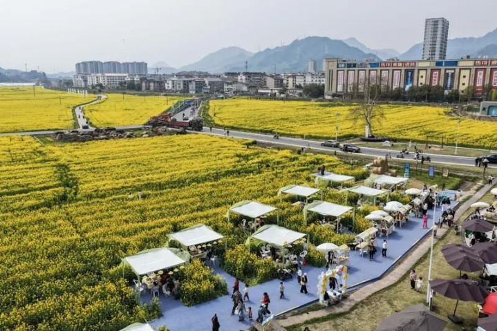3月15日,建德市更楼街谈城南城市田园油菜花田边的耗尽市集蛊惑了开阔匹夫、搭客(无东谈主机像片)。新华社记者徐昱摄