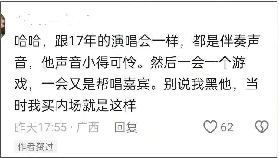 线上网友看完现场更气炸!全程放伴奏垫音,泰半首歌齐不张嘴。这哪是开演唱会,纯纯把不雅众当冤大头哄骗!