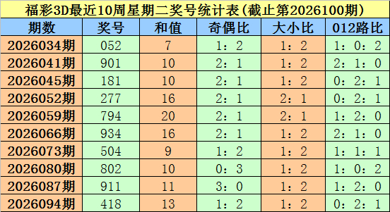 福彩3D第2026094期(上周星期二)奖号为418。其中奖号奇偶比为1:2,大小比为1:2,012路比为0:2:1。