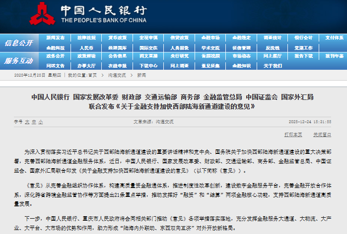 【环球网财经综合报道】为加快完善西部陆海新通道金融服务体系,中国人民银行等八部门于12月24日联合发布《关于金融支持加快西部陆海新通道建设的意见》(下称《意见》),推出涵盖六大方面共21条重点举措。文件明确要求充分发挥好“融资”和“结算”两项金融核心功能,全面增强跨省(区、市)及跨境金融要素配置能力,为通道建设提供强有力的金融支撑。