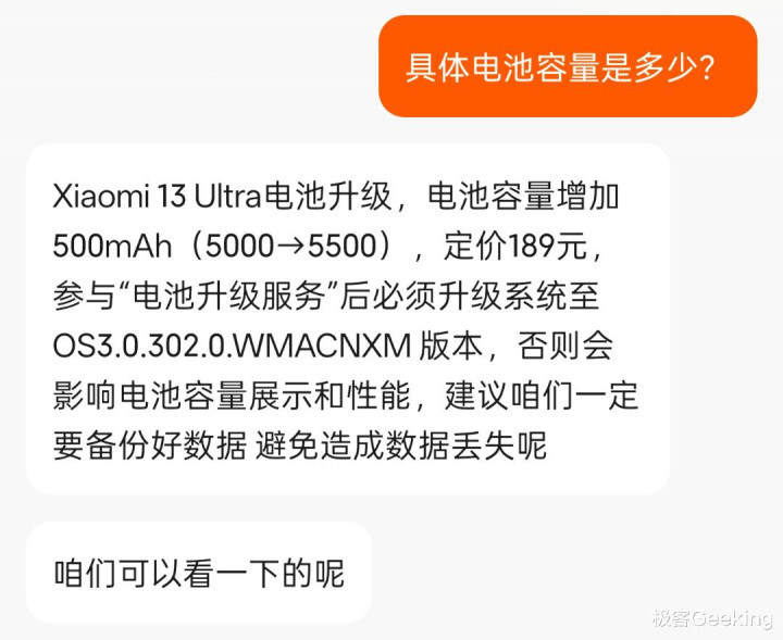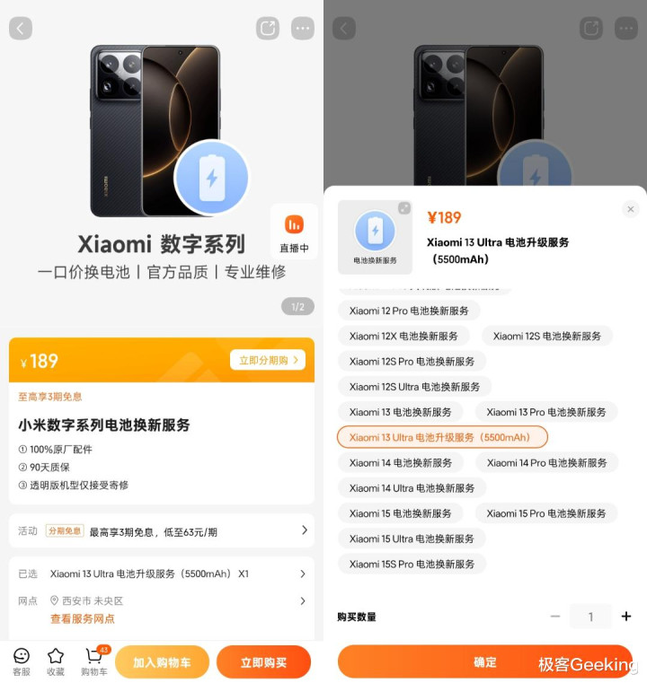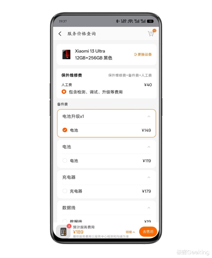 咫尺首批已上线小米13 Ultra 的「电板升级」,物料费+东说念主工费总价是 189 元。