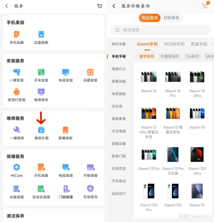 那么若何找到小米的官方电板扩容升级做事?大开「小米商城」App-「做事」-「沿路做事」,下滑找到「维修做事」-「维修价钱」,找到对应机型就能发现这一做事。
