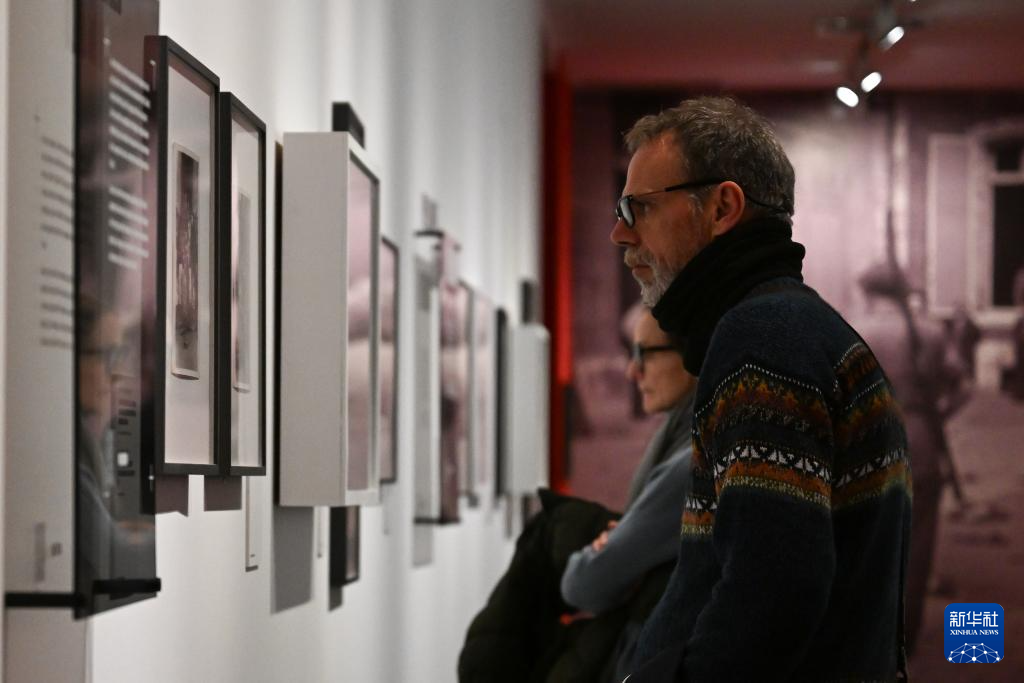 12月20日,在西班牙马德里,参观者在展览上走过罗伯特·卡帕的作品。