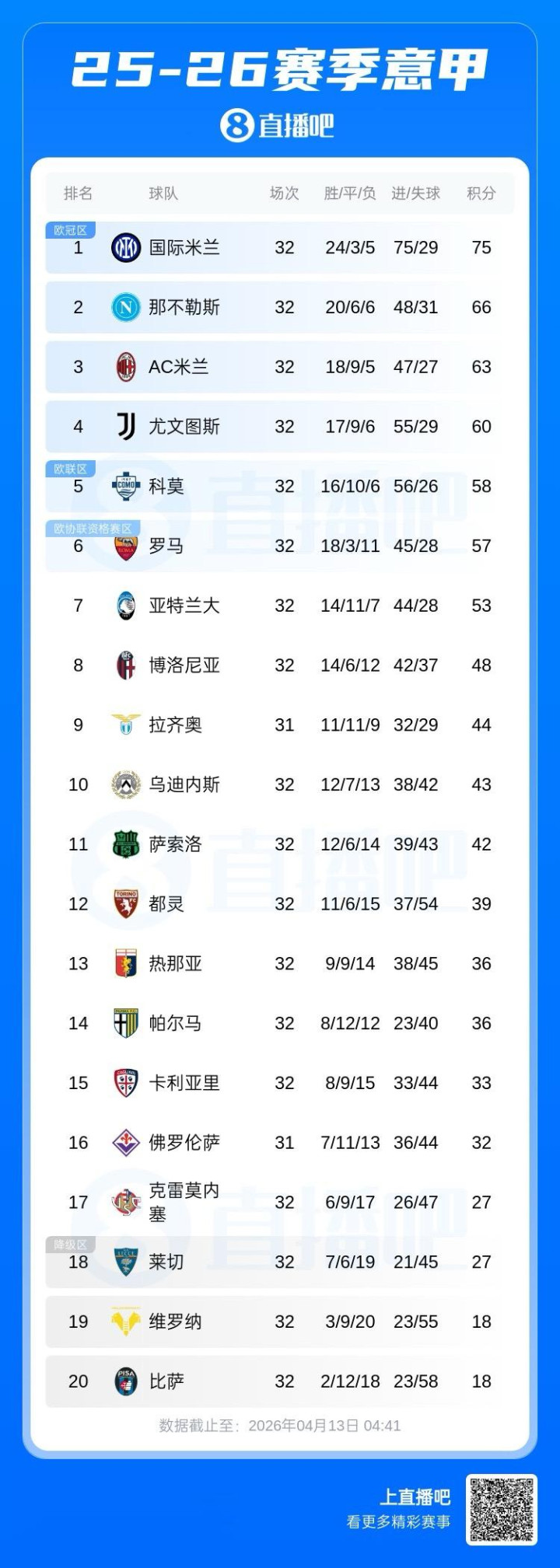 直播吧04月13日讯本轮意甲,国米4-3逆转科莫,早些遏抑的那不勒斯1-1帕尔马。最新积分榜,幸运飞艇APP官网下载国米剩余6轮以9分上风领跑!