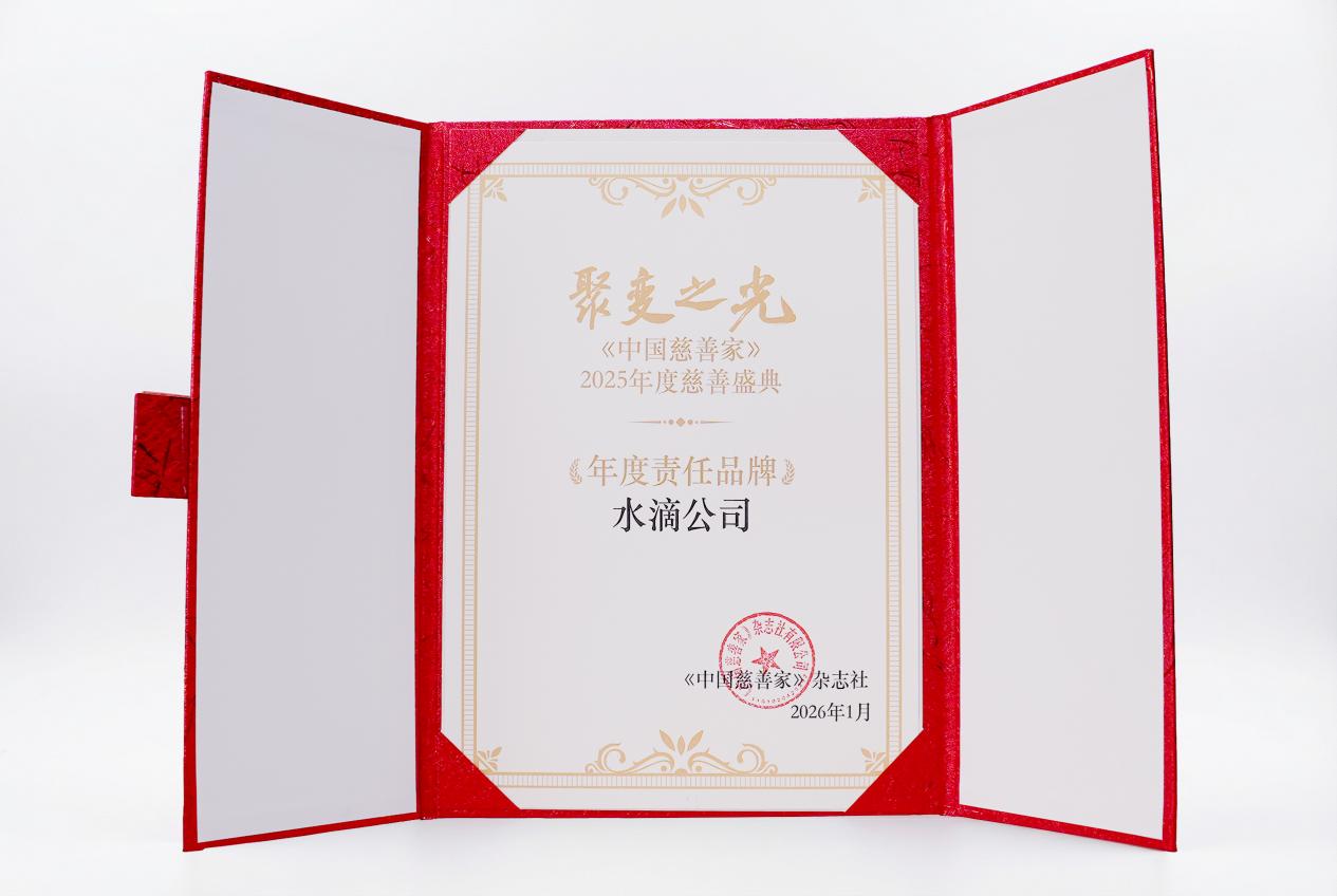 【环球网财经综合报道】近日,由《中国慈善家》杂志主办的“聚变之光”2025年度慈善盛典在北京举行,盛典现场揭晓了年度榜样机构、年度优秀项目、年度优秀传播案例、年度责任品牌以及年度ESG先锋五大奖项。水滴公司凭借在社会责任领域的持续实践与探索荣获“年度责任品牌”奖。